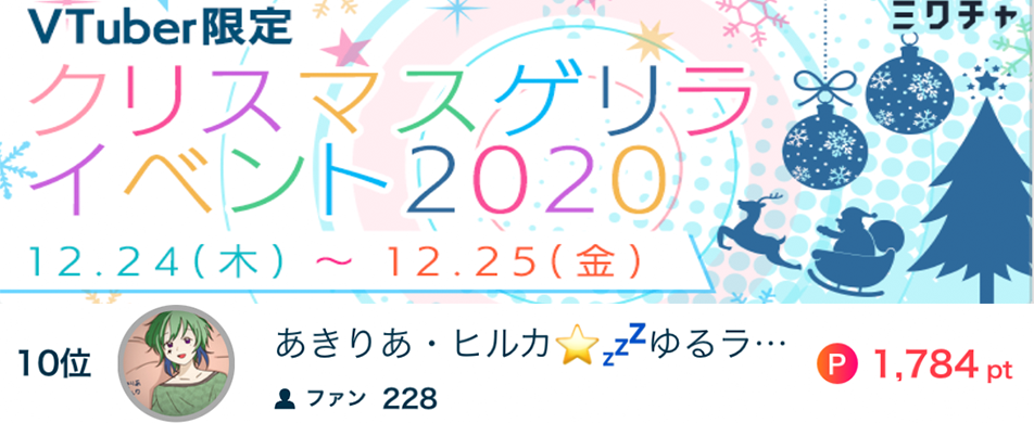 あきりあ・ヒカル⭐️💤ゆるライバーがVTuber限定 クリスマスゲリライベント2020で10位になりました🌈 あきりあ・ヒカル⭐️💤ゆるライバーがVTuber限定 クリスマスゲリライベント2020で10位になりました🌈 応援してくださったリスナーの皆さん、ありがとうございました🎄 2020.12.25