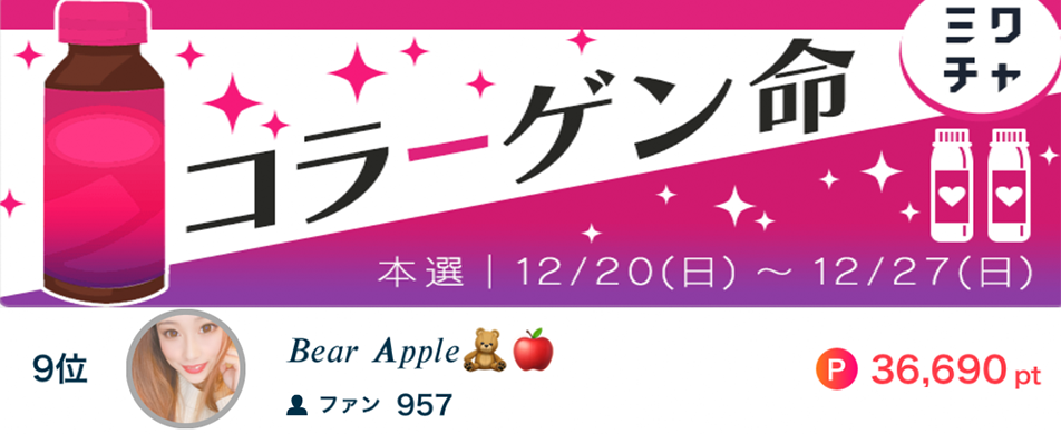 Bear Apple🧸🍎がコラーゲン命で9位になりました🔥 Bear Apple🧸🍎がコラーゲン命で9位になりました🔥 応援してくださったリスナーの皆さん、ありがとうございました🥤 2020.12.27