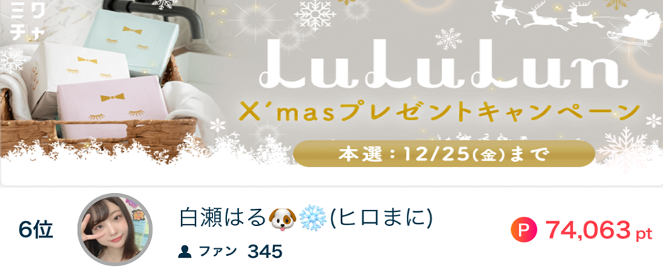 白瀬はる🐶❄️(ヒロまに)がLuLuLun X’masプレゼントキャンペーンで6位になりました✨ 白瀬はる🐶❄️(ヒロまに)がLuLuLun X’masプレゼントキャンペーンで6位になりました✨ 応援してくださったリスナーの皆さん、ありがとうございました🧣 2020.12.25
