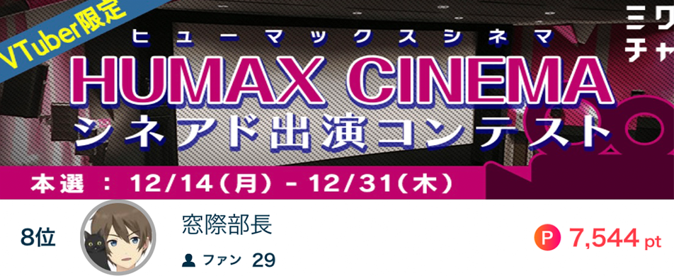 窓際部長がVTuber限定 HUMAX CINEMA シネアド出演コンテストで7位になりました❗️❗️ 窓際部長がVTuber限定 HUMAX CINEMA シネアド出演コンテストで7位になりました❗️❗️ 応援してくださったリスナーの皆さん、ありがとうございました🎥 2020.12.31