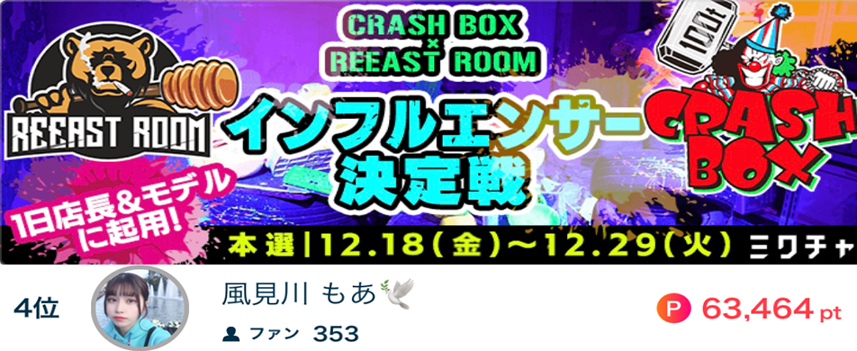 風見川もあ🕊がCRASH BOX ✖︎ REEAST ROOMインフルエンサー決定戦で4位になりました🎖✨ 風見川もあ🕊がCRASH BOX ✖︎ REEAST ROOMインフルエンサー決定戦で4位になりました🎖✨ 応援してくださったリスナーの皆さん、ありがとうございました🤩🌟 2020.12.29