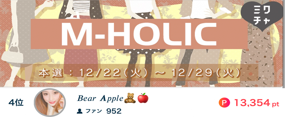Bear Apple🧸🍎がM-HOLICで4位になりました🎖✨ Bear Apple🧸🍎がM-HOLICで4位になりました🎖✨ 応援してくださったリスナーの皆さん、ありがとうございました🎉 2020.12.29