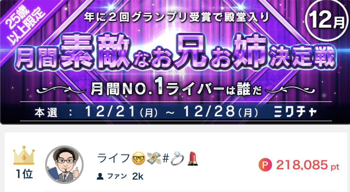 ライフ🤓💸が月間素敵なお兄お姉決定戦で1位になりました🥇👑 ライフ🤓💸が月間素敵なお兄お姉決定戦で1位になりました🥇👑 応援してくださったリスナーの皆さん、ありがとうございました🥇🥇✨ 2020.12.28