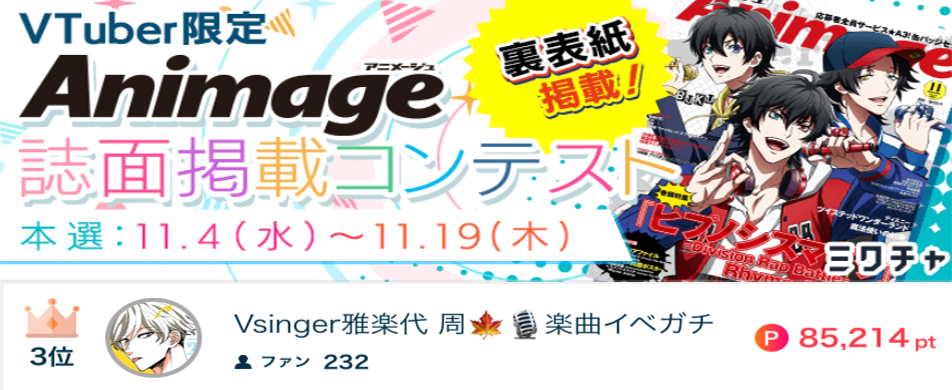 Vsinger雅楽代🍁🎙がAnimage誌面搭載コンテスト【Vtubar限定】で3位になりました🥉✨✨ Vsinger雅楽代🍁🎙がAnimage誌面搭載コンテスト【Vtubar限定】で3位になりました🥉✨✨ 応援してくださったリスナーの皆さん、ありがとうございました📖📣 2020.11.19