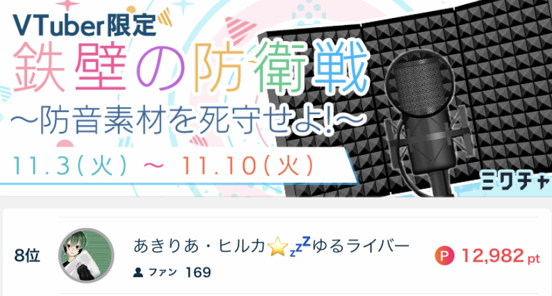あきりあ・ヒカル⭐️💤ゆるライバーがVTuber限定鉄壁の防御戦〜防音素材を死守せよ!〜で8位になりました✨ あきりあ・ヒカル⭐️💤ゆるライバーがVTuber限定鉄壁の防御戦〜防音素材を死守せよ!〜 で8位になりました✨ 応援してくださったリスナーの皆さん、ありがとうございました🎤 2020.11.10