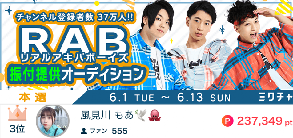 風見川もあ🕊🐙がRAB振付提供オーディションで3位になりました🥉🕺 風見川もあ🕊🐙がRAB振付提供オーディションで3位になりました🥉🕺 応援してくださったリスナーの皆さん、ありがとうございました✨ 2021.6.13