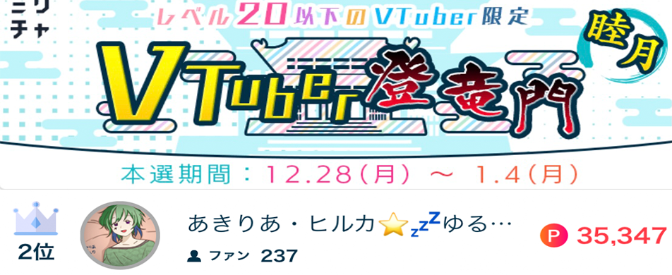 あきりあ・ヒカル⭐️💤ゆるライバーがVTuber登竜門で2位になりました🥈✨ あきりあ・ヒカル⭐️💤ゆるライバーがVTuber登竜門で2位になりました🥈✨ 応援してくださったリスナーの皆さん、ありがとうございました🥈🥈🐉 2021.1.4