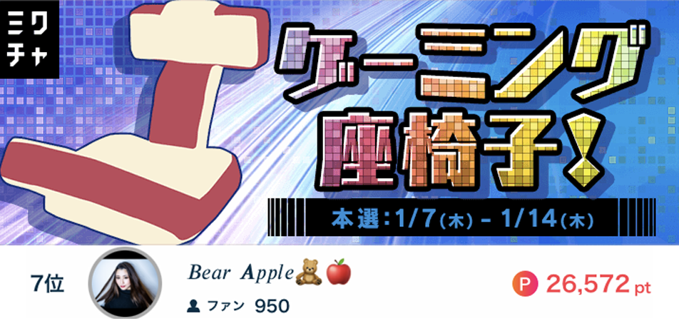 Bear Apple🧸🍎がゲーミング座椅子で7位になりました🌈 Bear Apple🧸🍎がゲーミング座椅子で7位になりました🌈 応援してくださったリスナーの皆さん、ありがとうございました💺🎮 2021.1.14