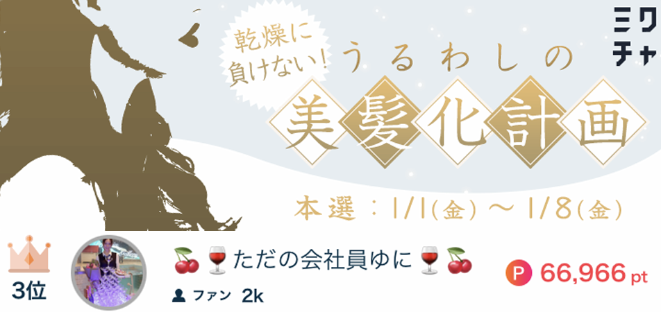 🍒🍷ただの会社員ゆに🍷🍒がうるわしの美髪化計画で3位になりました🥉✨ 🍒🍷ただの会社員ゆに🍷🍒がうるわしの美髪化計画で3位になりました🥉✨ 応援してくださったリスナーの皆さん、ありがとうございました🎉 2021.1.8