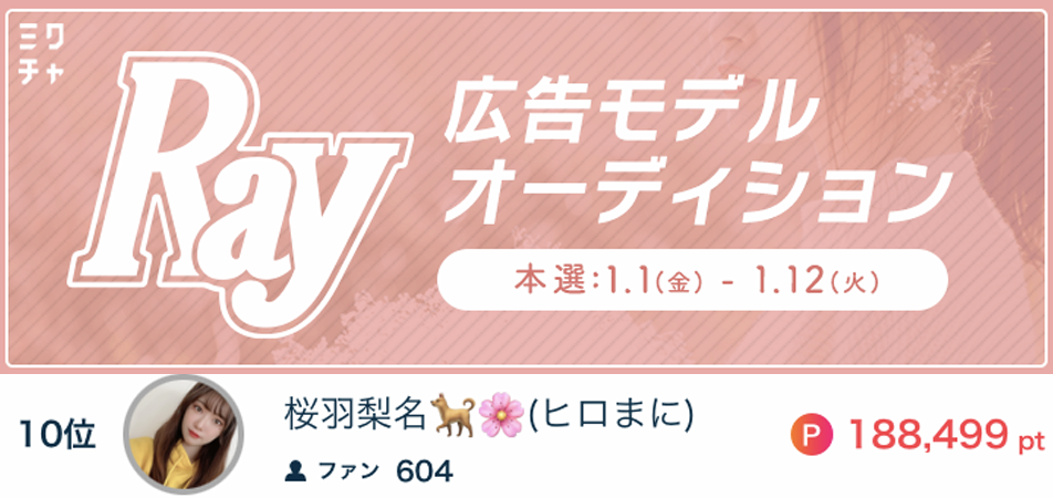 桜羽梨名🐕🌸がRay広告モデルオーディションで10位になりました🏅📕💖 桜羽梨名🐕🌸がRay広告モデルオーディションで10位になりました🏅📕💖 応援してくださったリスナーの皆さん、ありがとうございました✨ 2021.1.12