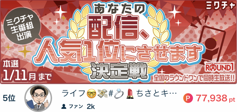 ライフ🤓💸があなたの配信、人気1位にさせます決定戦で5位になりました🏅⭐️ ライフ🤓💸があなたの配信、人気1位にさせます決定戦で5位になりました🏅⭐️ 応援してくださったリスナーの皆さん、ありがとうございました🍾✨ 2021.1.11