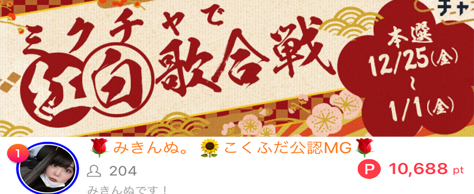 🌹みきんぬ。🌻こくふだ公認MG🌹がミクチャで紅白歌合戦青組で1位になりました🥇✨ 🌹みきんぬ。🌻こくふだ公認MG🌹がミクチャで紅白歌合戦青組で1位になりました🥇✨ 応援してくださったリスナーの皆さん、ありがとうございました🥇🥇🥇 2021.1.1