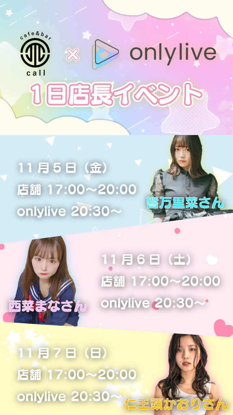 cafe&bar call×only live 1日店長イベント cafe&bar call×only live 1日店長イベント開催決定! 開催日程:2021年11月5日〜7日 ①カフェ&バー1日店長(17:00-20:00) 場所:cafe&bar call […] 2021.10.26