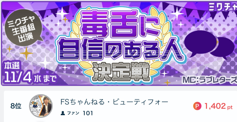 FSちゃんねる・ビューティーフォーが毒舌に自信がある人決定戦で8位になりました✨ FSちゃんねる・ビューティーフォーが毒舌に自信がある人決定戦で8位になりました✨ 応援してくださったリスナーの皆さん、ありがとうございました💬 2020.11.4