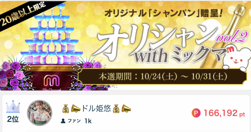 💰📣ドル姫悠💰📣がオリシャンwithミックマで2位になりました🥈✨ 💰📣ドル姫悠💰📣がオリシャンwithミックマで2位になりました🥈✨ 応援してくださったリスナーの皆さん、ありがとうございました🍾 2020.10.30