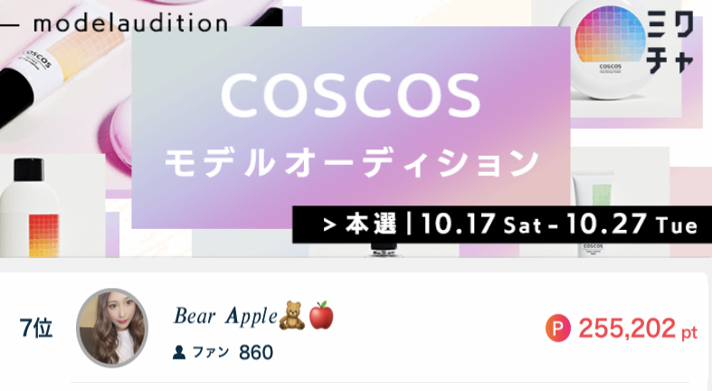 Bear Apple🧸🍎がCOSCOSモデルオーディションで7位になりました✨ Bear Apple🧸🍎がCOSCOSモデルオーディションで7位になりました✨ 応援してくださったリスナーの皆さん、ありがとうございました💄 2020.10.27
