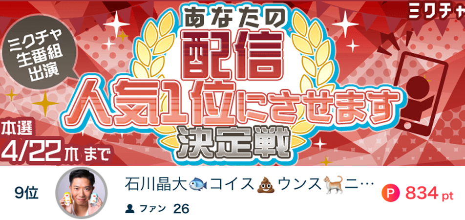 石川晶大🐟コイス💩ウンス🐈ニャンス作者があなたの配信人気1位にさせます決定戦で9位になりました🎖🐟 石川晶大🐟コイス💩ウンス🐈ニャンス作者があなたの配信人気1位にさせます決定戦で9位になりました🎖🐟 応援してくださったリスナーの皆さん、ありがとうございました✴️ 2021.4.22