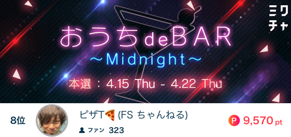 ピザT🍕(FSチャンネル)がおうちdeBAR~Midnight~で8位になりました🎖🍸 ピザT🍕(FSチャンネル)がおうちdeBAR~Midnight~で8位になりました🎖🍸 応援してくださったリスナーの皆さん、ありがとうございました🎉 2021.4.22