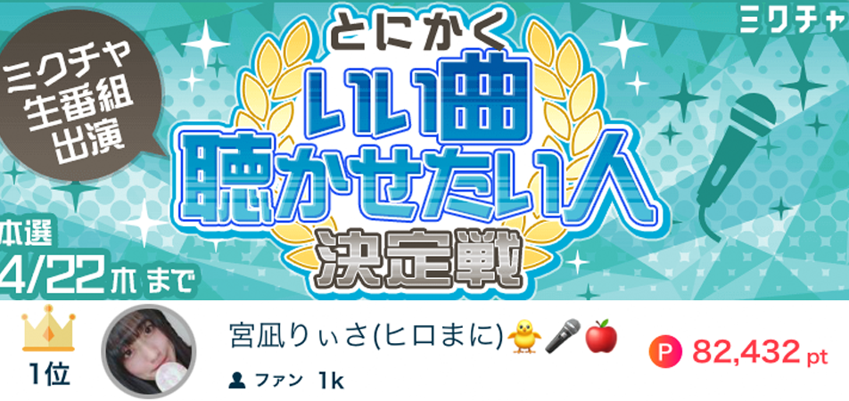 宮凪りぃさ(ヒロまに)がとにかくいい曲聴かせたい人決定戦で1位になりました🥇🎤 宮凪りぃさ(ヒロまに)がとにかくいい曲聴かせたい人決定戦で1位になりました🥇🎤 応援してくださったリスナーの皆さん、ありがとうございました💖 2021.4.22