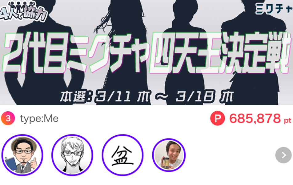 ライフ🤓💸が参加しました『type:Me』が2代目ミクチャ四天王決定戦で3位になりました🥉👑 ライフ🤓💸が参加しました『type:Me』が2代目ミクチャ四天王決定戦で3位になりました🥉👑 また、チーム内では1位を獲得しました❗️ 応援してくださったリスナーの皆さん、ありがとうございました✨ 2021.3.18