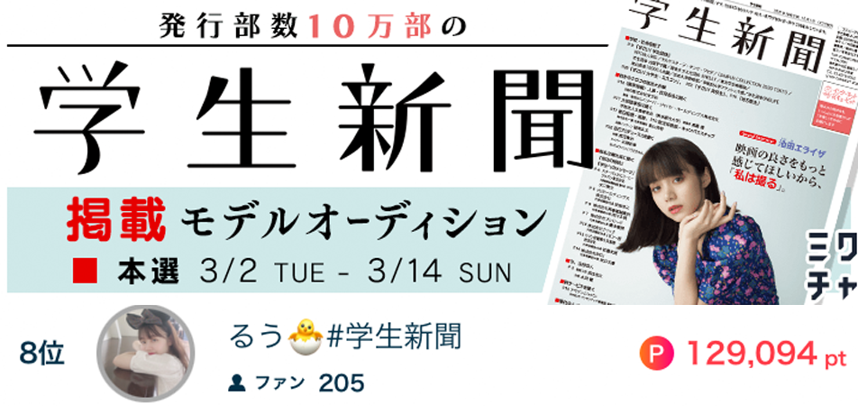 るう🐣が学生新聞掲載モデルオーディションで8位になりました🎖🎓 るう🐣が学生新聞掲載モデルオーディションで8位になりました🎖🎓 応援してくださったリスナーの皆さん、ありがとうございました🌟 2021.3.14