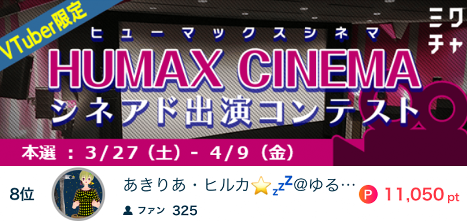 あきりあ・ヒカル⭐️💤がVTuber限定・HUMAX CINEMAシネアド出演コンテストで8位になりました🎖🎬 あきりあ・ヒカル⭐️💤がHUMAX CINEMAシネアド出演コンテストで8位になりました🎖🎬 応援してくださったリスナーの皆さん、ありがとうございました✨ 2021.4.9