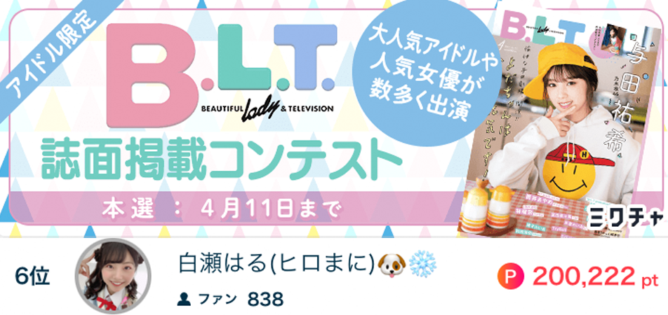 白瀬はる(ヒロまに)🐶❄️がB.L.T.誌面掲載コンテスト(アイドル限定)で6位になりました🎖🎤 白瀬はる(ヒロまに)🐶❄️がB.L.T.誌面掲載コンテスト(アイドル限定)で6位になりました🎖🎤 応援してくださったリスナーの皆さん、ありがとうございました❣️ 2021.4.11