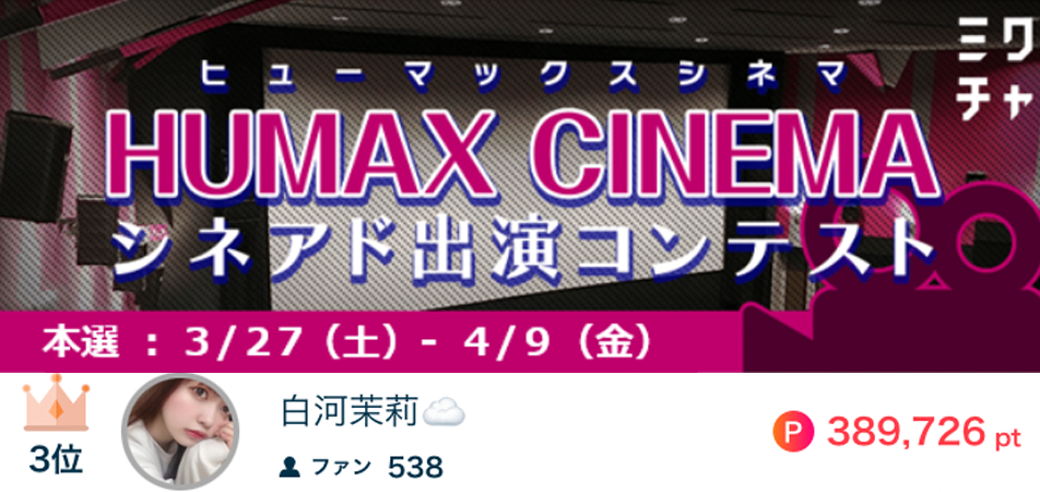 白河茉莉☁️がHUMAX CINEMAシネアド出演コンテストで3位になりました🥉🎬 白河茉莉☁️がHUMAX CINEMAシネアド出演コンテストで3位になりました🥉🎬 応援してくださったリスナーの皆さん、ありがとうございました🎉 2021.4.9