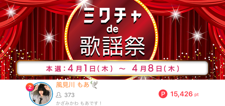 風見川もあ🕊がミクチャde歌謡祭のC-2内で2位になりました🥈🎤 風見川もあ🕊がミクチャde歌謡祭のC-2内で2位になりました🥈🎤 応援してくださったリスナーの皆さん、ありがとうございました🌟 2021.4.8