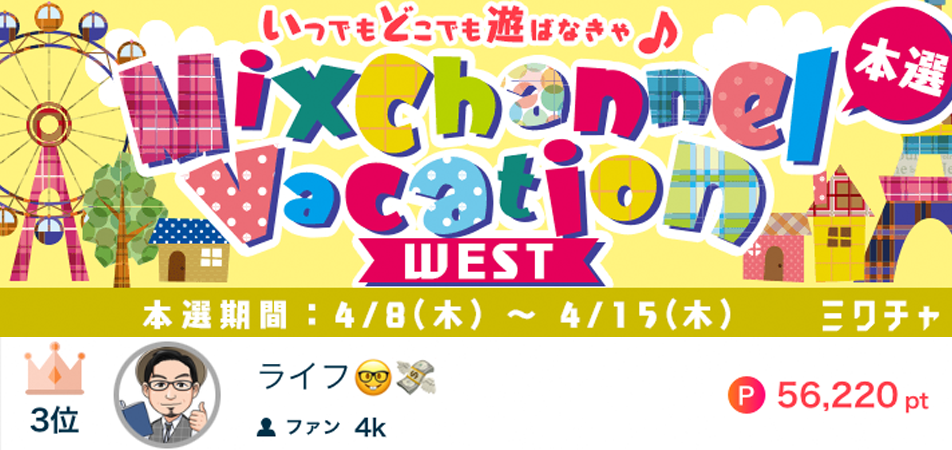 ライフ🤓💸がMixchannel vacation WESTで3位になりました🥉🏰 ライフ🤓💸がMixchannel vacation WESTで3位になりました🥉🏰 応援してくださったリスナーの皆さん、ありがとうございました⭐️ 2021.4.15