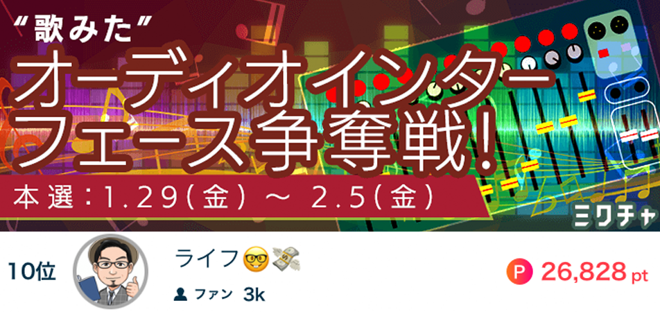 ライフ🤓💸が”歌ってみた”オーディオインターフェース争奪戦!で10位になりました🏅🎧 ライフ🤓💸が”歌ってみた”オーディオインターフェース争奪戦!で10位になりました🏅🎧 応援してくださったリスナーの皆さん、ありがとうございました‼️ 2021.2.5