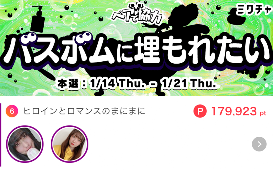 ヒロインとロマンスのまにまに(宮凪りぃさ・桜羽梨名)がバスボムに埋もれたいで6位になりました🏅❣️ ヒロインとロマンスのまにまに(宮凪りぃさ・桜羽梨名)がバスボムに埋もれたいで6位になりました🏅❣️ 応援してくださったリスナーの皆さん、ありがとうございました🛁⭐️ 2021.1.21