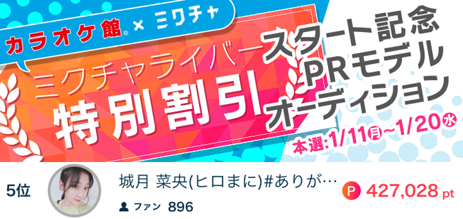 城月菜央がカラオケ館×ミクチャ ミクチャライバー特別割引スタート記念PRモデルオーディションで5位になりました🏅🎉 城月菜央がカラオケ館×ミクチャ ミクチャライバー特別割引スタート記念PRモデルオーディションで5位になりました🏅🎉 また、指定アイテム1位にも輝きました❗️ 応援してくださったリスナーの皆さん、ありがとうございました🐔🎤 2021.1.20