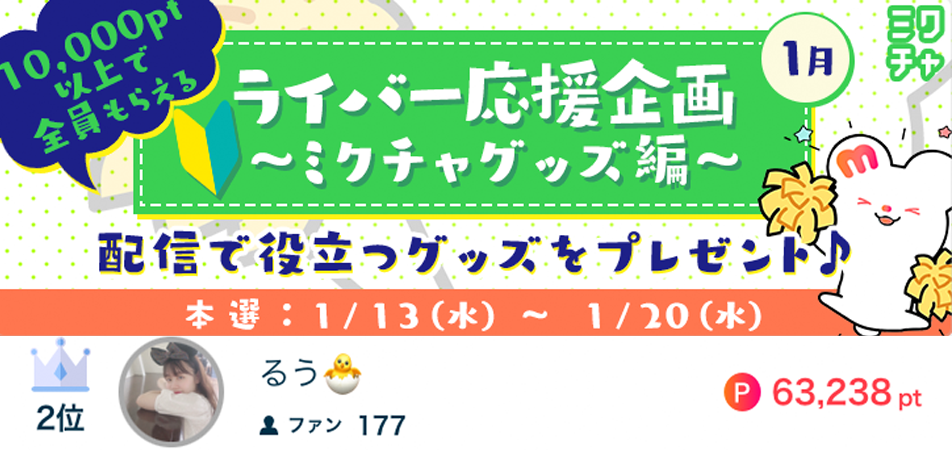 るう🐣がライバー応援企画〜ミクチャグッツ編〜で2位になりました🥈🧸✨ るう🐣がライバー応援企画〜ミクチャグッツ編〜で2位になりました🥈🧸✨ 応援してくださったリスナーの皆さん、ありがとうございました✨ 2021.1.20