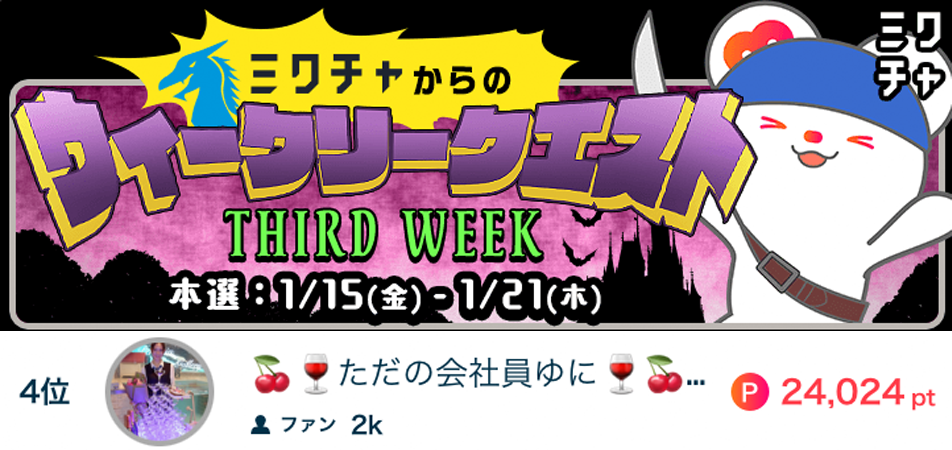 🍒🍷ただの会社員ゆに🍷🍒がミクチャからのウィークリークエストで4位になりました🏅🌟 🍒🍷ただの会社員ゆに🍷🍒がミクチャからのウィークリークエストで4位になりました🏅🌟 応援してくださったリスナーの皆さん、ありがとうございました☺️✨ 2021.1.21