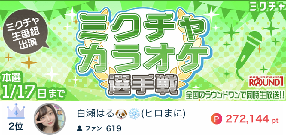 白瀬はる🐶❄️がミクチャカラオケ選手権で2位になりました🥳 白瀬はる🐶❄️がミクチャカラオケ選手権で2位になりました🥳 応援してくださったリスナーの皆さん、ありがとうございました🎤✨ 2021.1.17