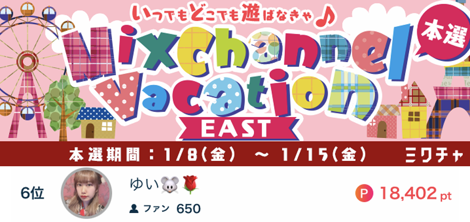 ゆい🐭🌹がMixChannelVacationで6位になりました🎉 ゆい🐭🌹がMixChannelVacationで6位になりました🎉 応援してくださったリスナーの皆さん、ありがとうございました🐭💖 2021.1.15
